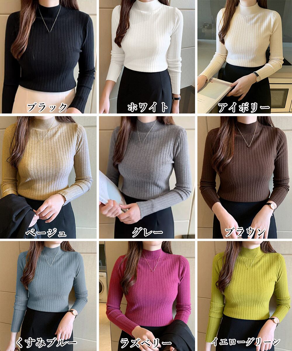 韓国リブニットトップス ハイネック 長袖