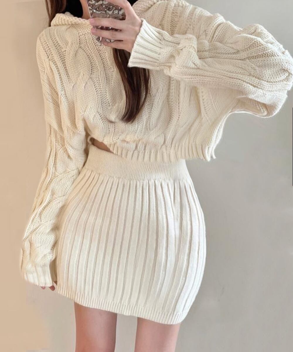 大胆でセクシーな魅力を纏った、ケーブルニットパーカーとミニスカートの上下セット