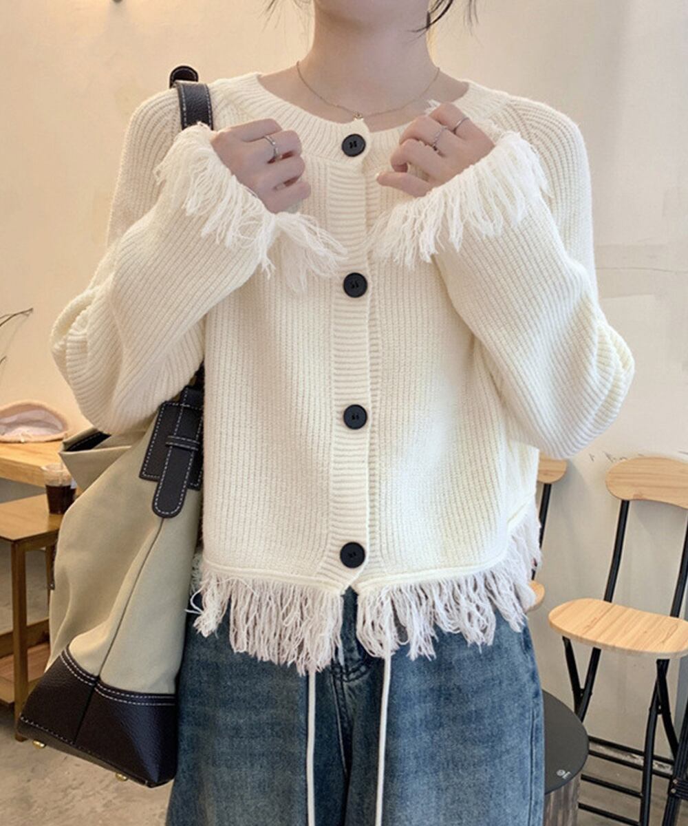 裾と袖口の目を惹くフリンジがかわいさを演出する