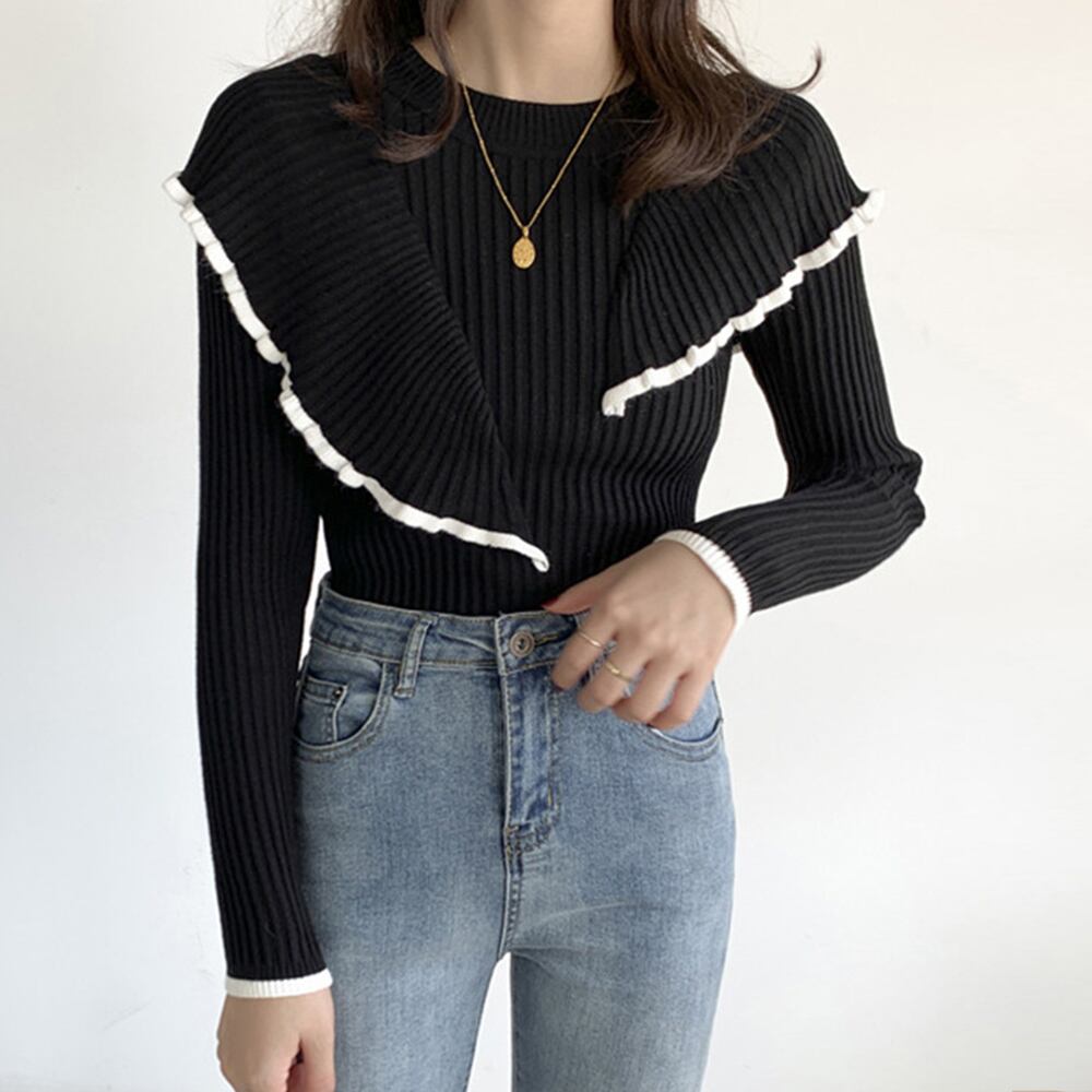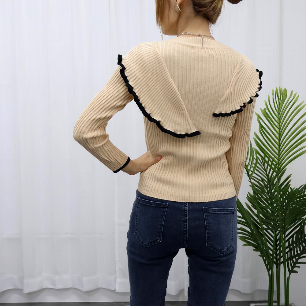 肩周りフリルのデザインが可愛くて、よい厚みのリブニット素材で暖かく、ロングシーズン活躍