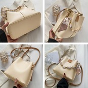 バックの持ち手全体に添わせて巻いているスカーフリボンがおしゃれ感ぐっと増すバケツバッグです