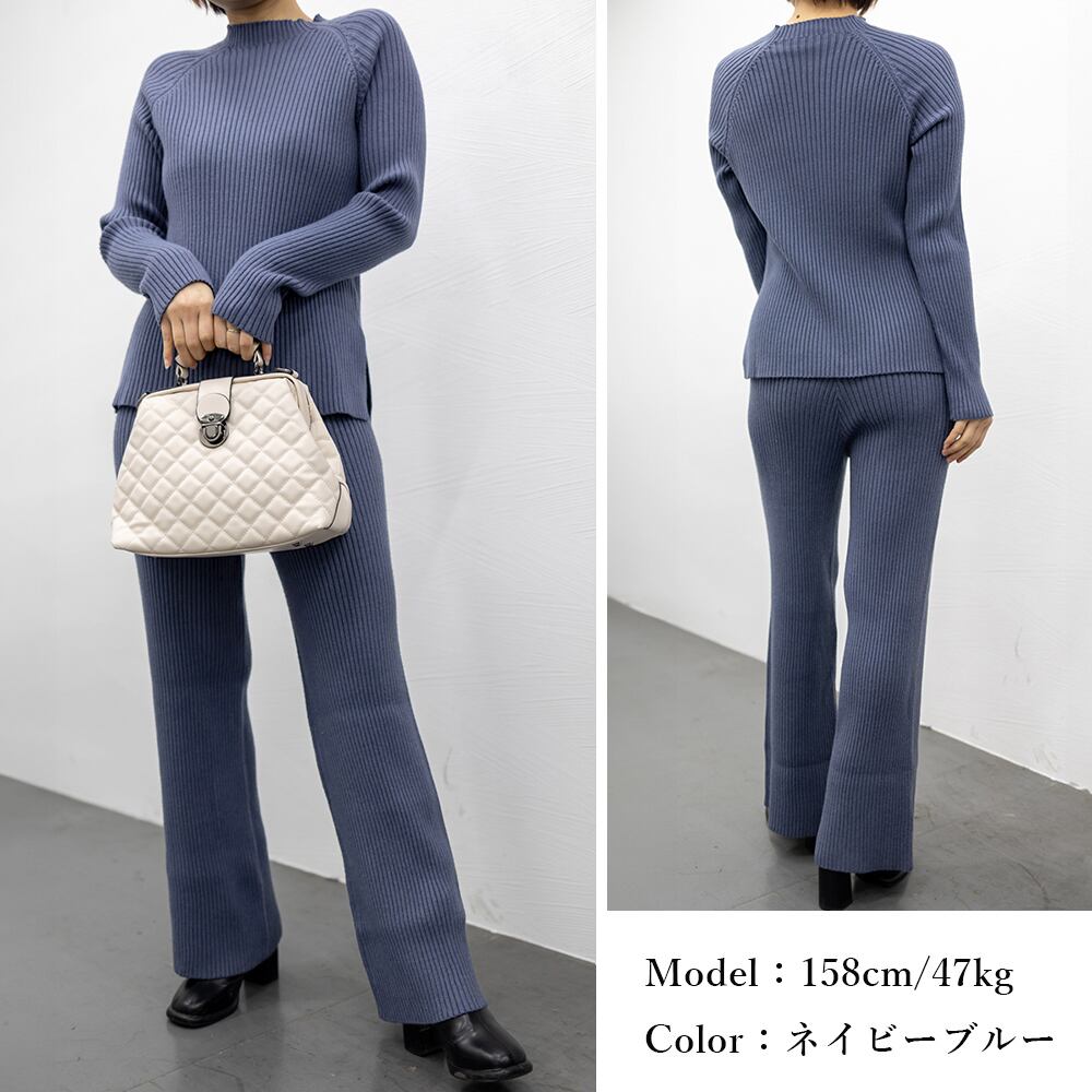 ニットアンサンブル スリット リブニットトップス 長袖 カジュアル ニットセミワイドパンツ 上下セット 30代40代