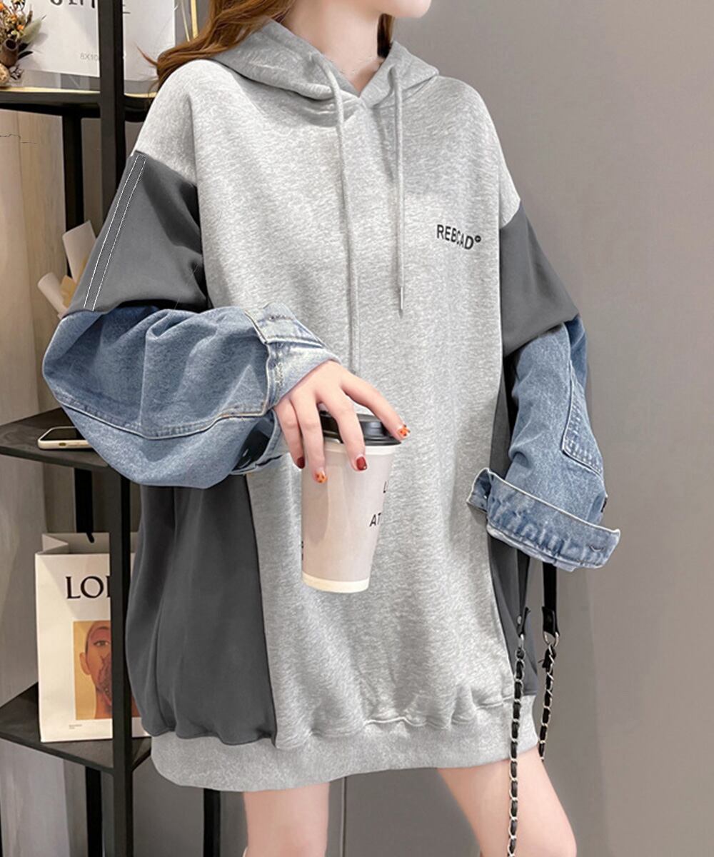 お尻まで隠れてさりげなく体型カバーする異素材mixデニムパーカー
