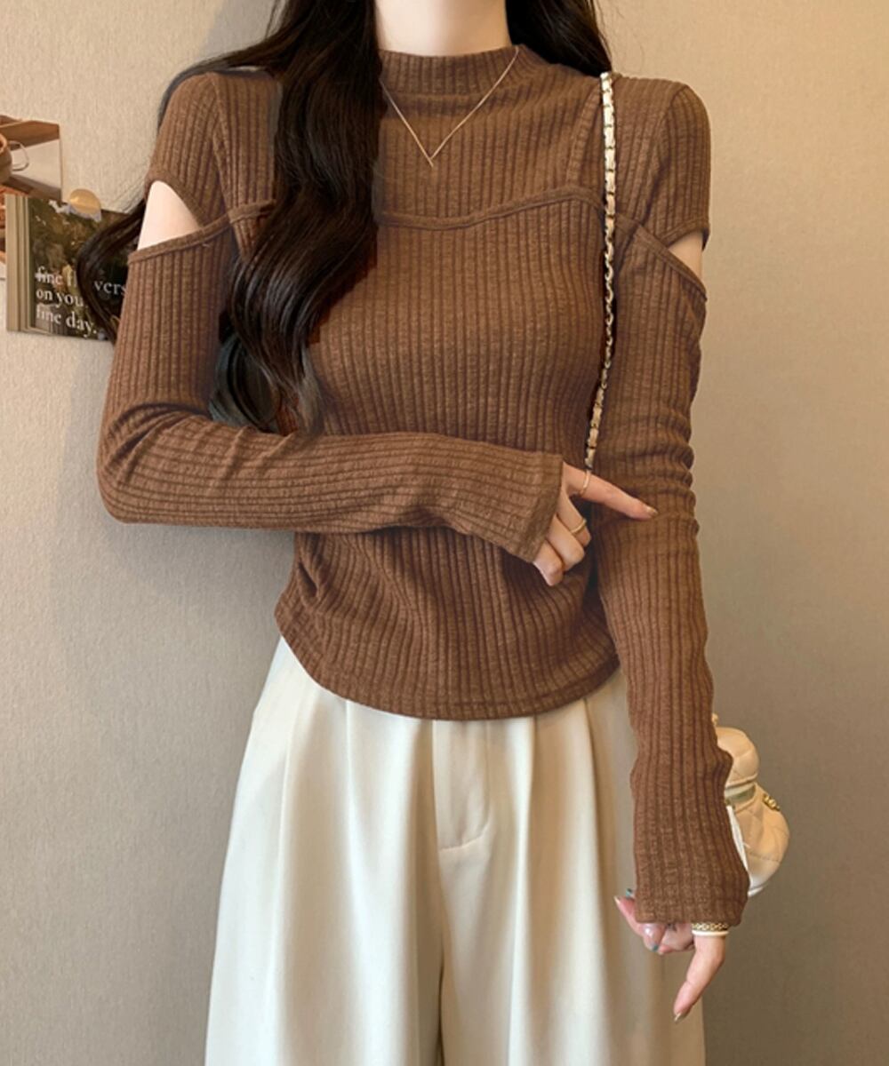 レディース カジュアル リブニットプルオーバー 普段着 長袖 ニットインナー 着やせ オープンカットトップス 秋冬新作