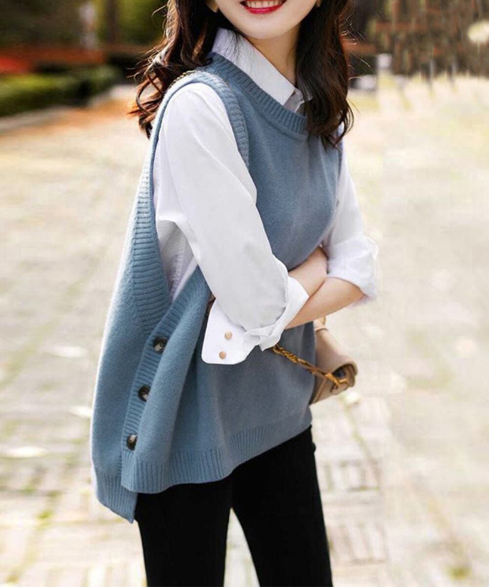 レディース 韓国ノースリーブ ニットトップス サイドボタン ラウンドネック ニットジレ プルオーバー カジュアル ベスト