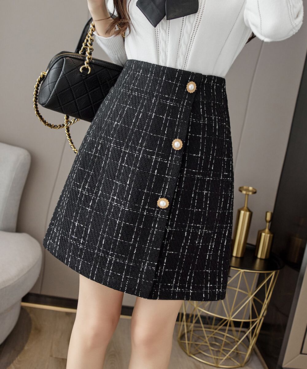 ツイード風素材で上品ムードを作り上げるミニ丈ラップ巻きスカート