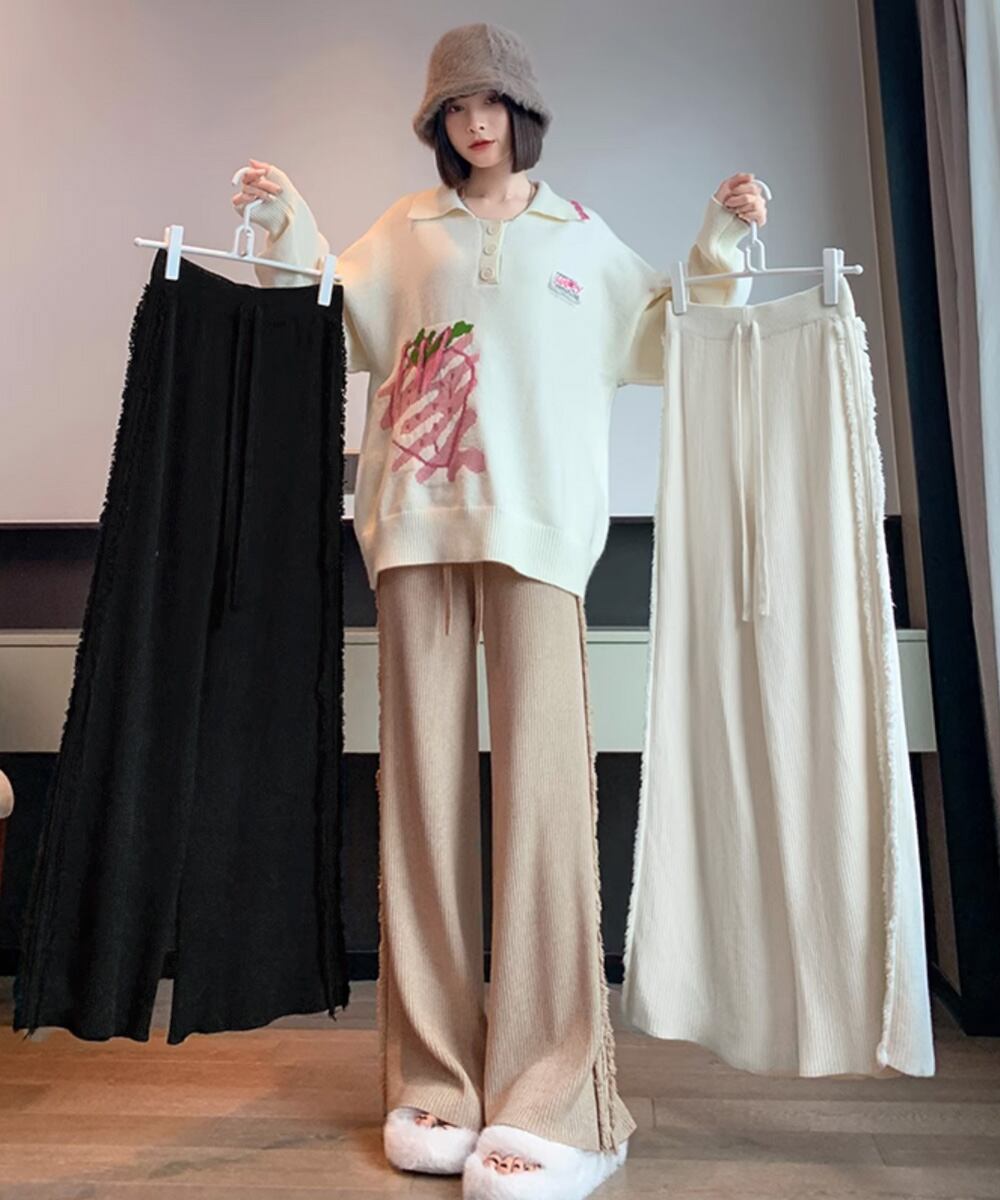 サイドにあしらったフリンジのラインが、プレーンなリブニットにひねりをプラスしているワイドパンツ