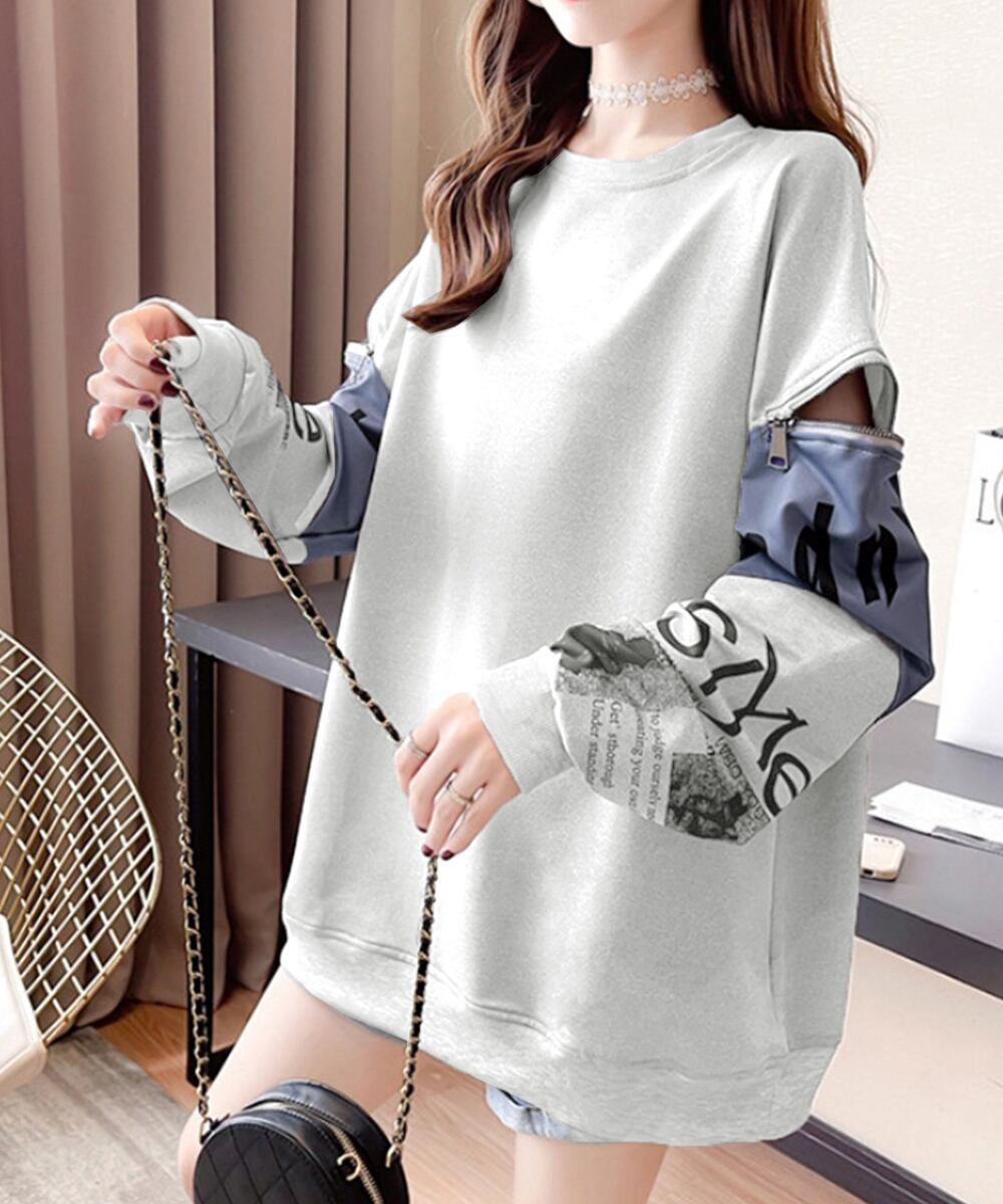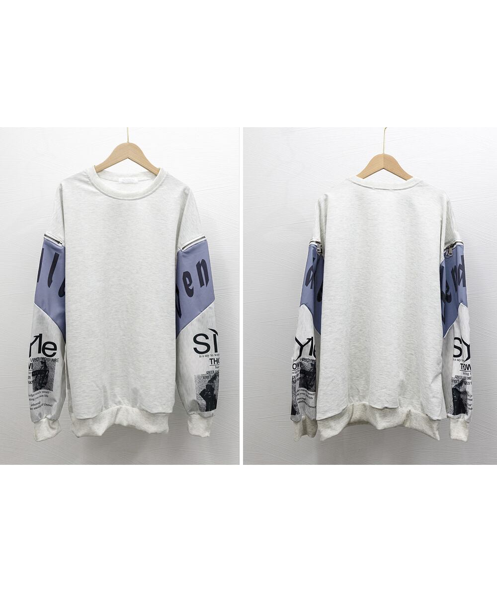 ロゴトレーナー長袖 ビッグtシャツ 袖ジッパー オーバーサイズロンt クルーネック 体型カバートップス 着やせ 薄手春服