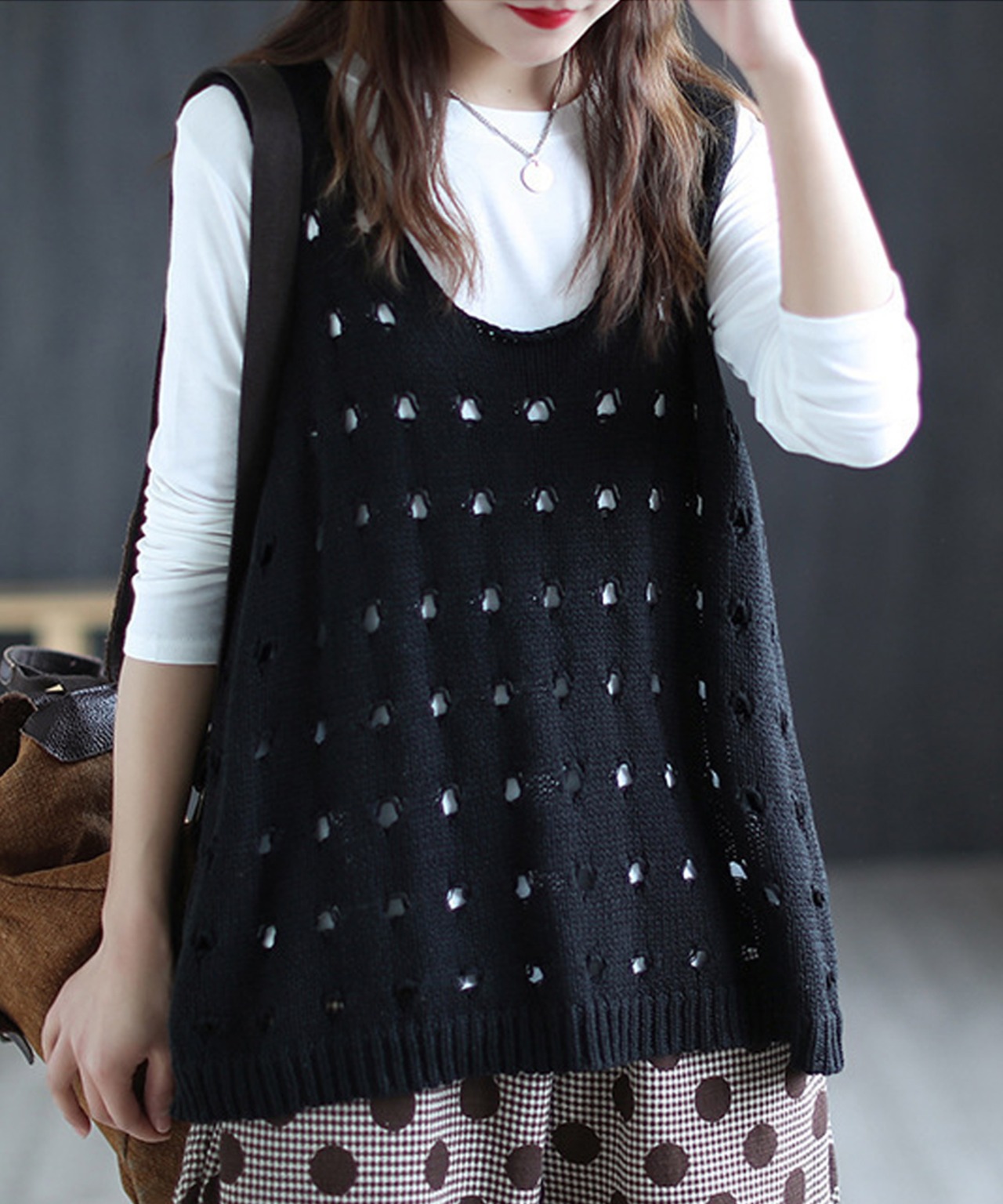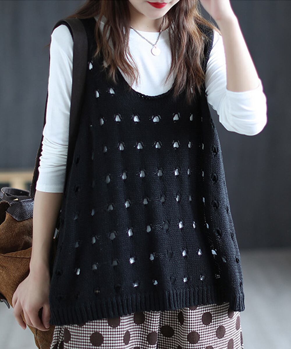 ニットジレ Uネック ニットチョッキ きれいめカジュアル 透かし編みニットゆったり 重ね着 無地プルオーバーノースリーブ