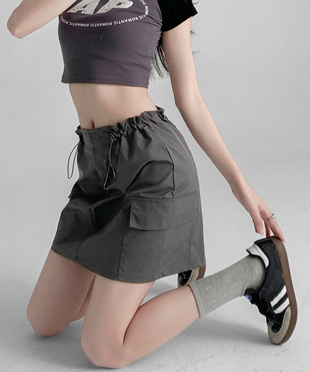 ワークスカート ショート丈 ドローコード 台形スカート おしゃれタイトスカート インナーパンツ付き 韓国カジュアル 春夏