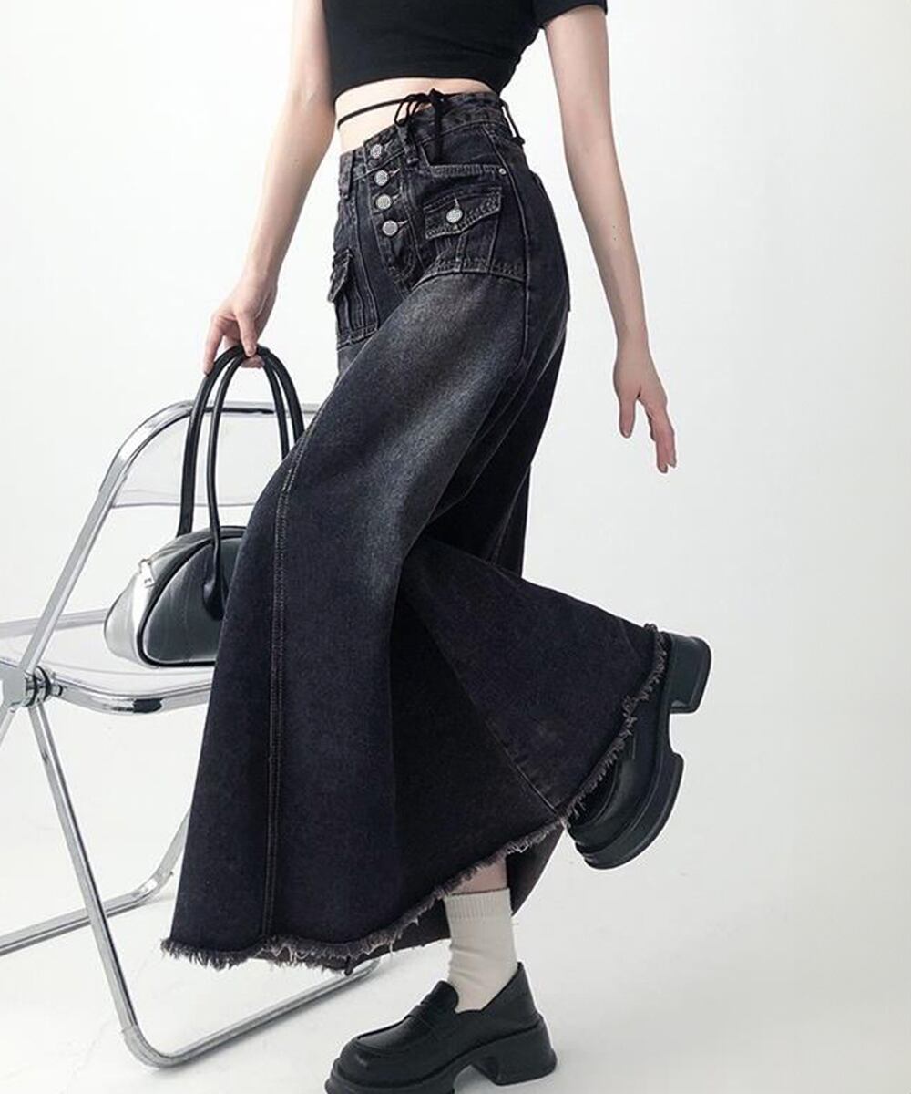 レディース オシャレ ロングスカート 切りっぱなし Aラインスカート 体型カバー フリンジ 着やせデニム ヴィンテージ風