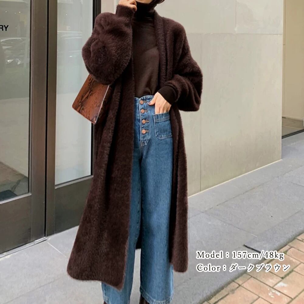 ふわふわシャギーニットとボリューム感のある袖が大人可愛い印象を与えてくれるロングカーディガン
