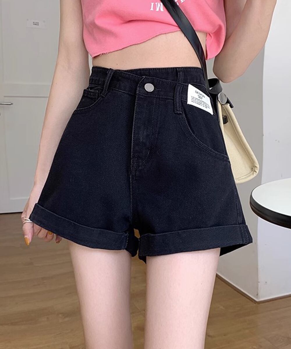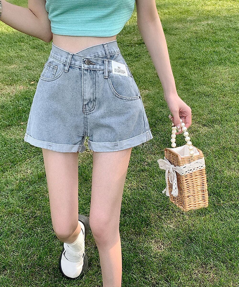 ロールアップホットパンツ Aラインハイウエスト カジュアルジーンズ ショートジーンズ アシンメトリーデニム