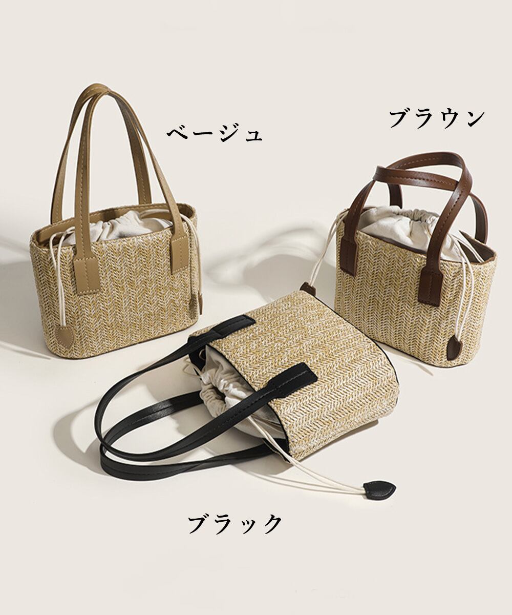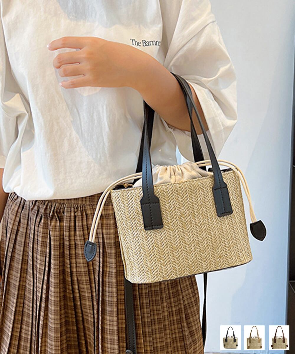 ミニスクエアバッグ 2WAY 草編み巾着袋バッグ トートバッグ 斜めがけ 浴衣小物 麦わらかばん 花火大会 手提げバッグ