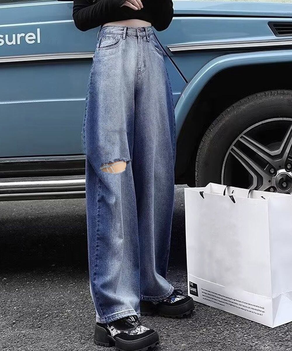 レディース ハイウエスト ストレートパンツ 着やせロングパンツ ゆったり ウォッシュジーンズ カットアウト デニムパンツ