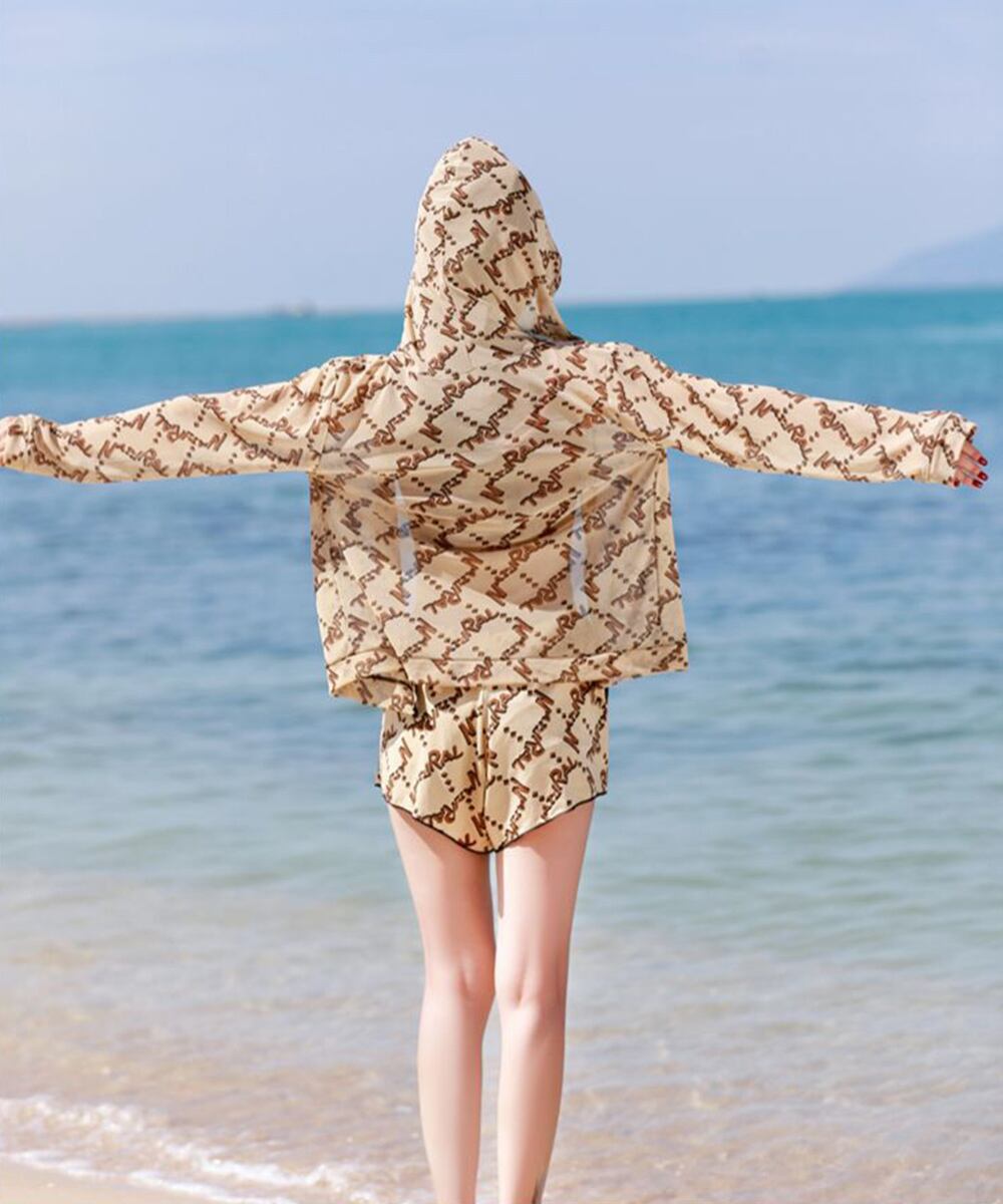 露出控えめ 水着3点セット 大人可愛い スイムウエア 英字柄 セパレート水着 日焼け防止 ラッシュガード付き 体型カバー