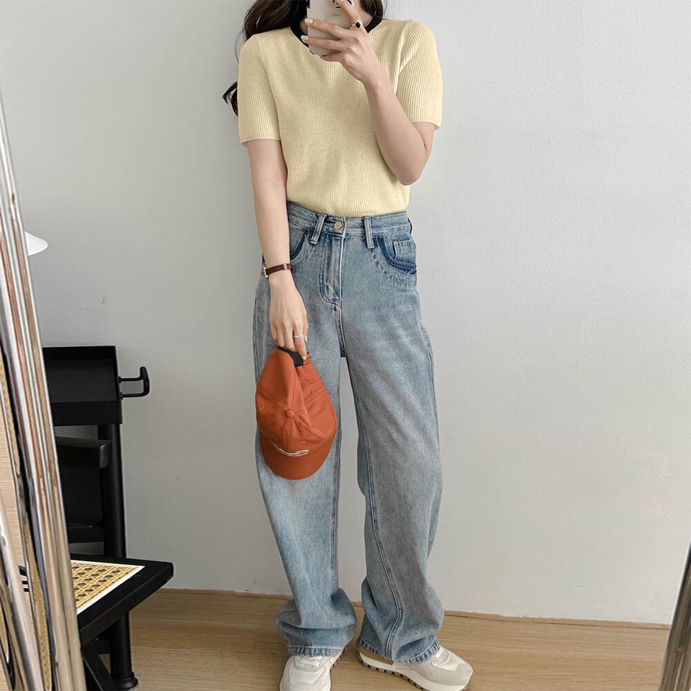 韓国 薄手ニットTシャツ オフィスカジュアル 通勤ニットソー クルーネック ニットトップス 着回し ラウンドネック 夏服