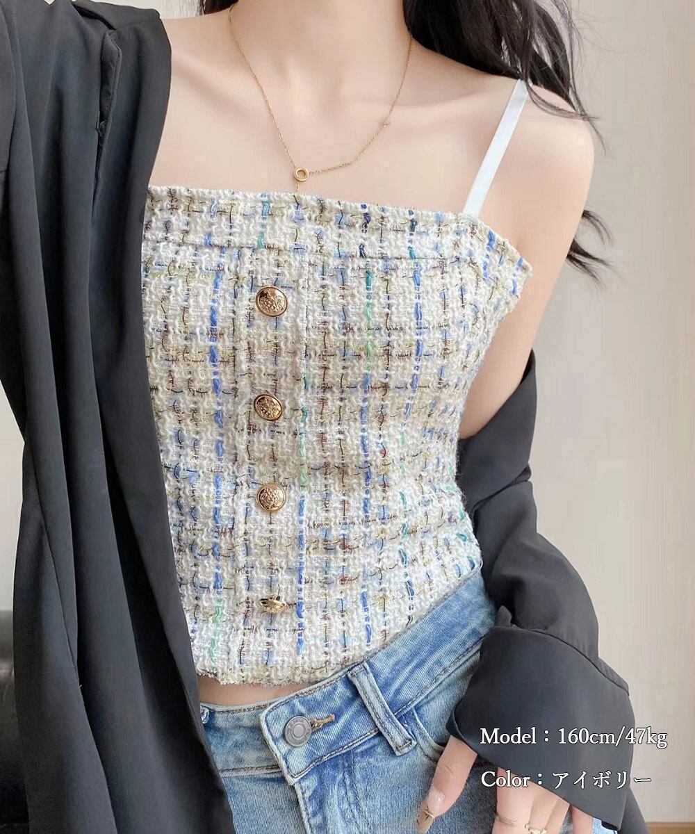この春夏シーズンにぴったりのツイード風キャミソールは、大人可愛いスタイルを演出するアイテム。