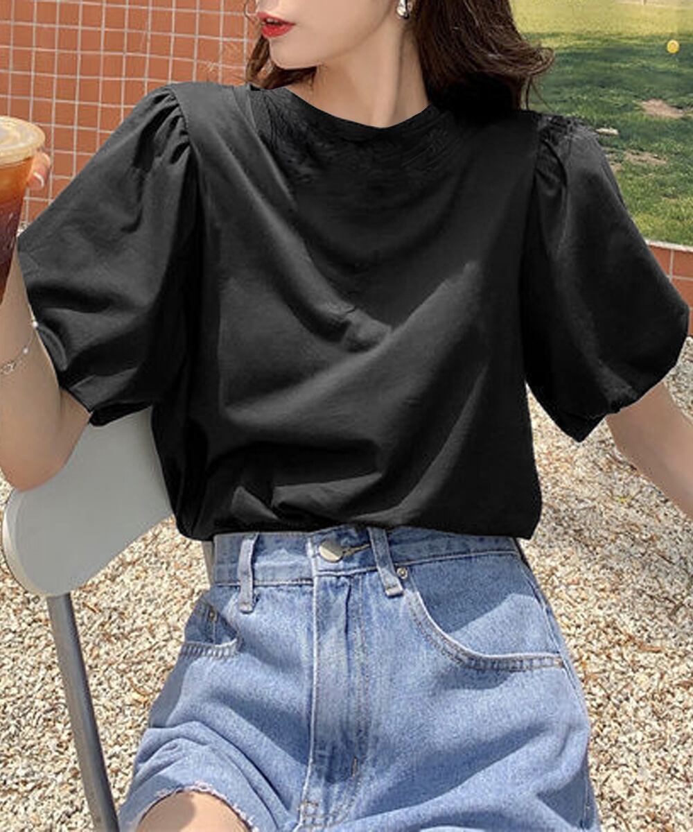 きれいめトップス春夏 シンプルtシャツ ボリューム袖カットソー バルーンスリーブブラウス クルーネックtシャツカジュアル