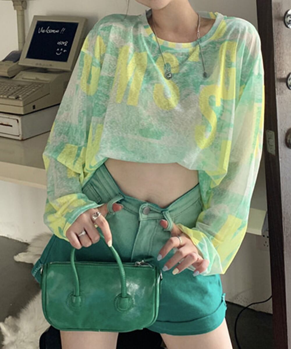 ムラ染めTシャツ 透け感 プルオーバー 英文字ロゴトップス 重ね着 セクシー 肌見せ クルーネックtシャツ 日焼け対策