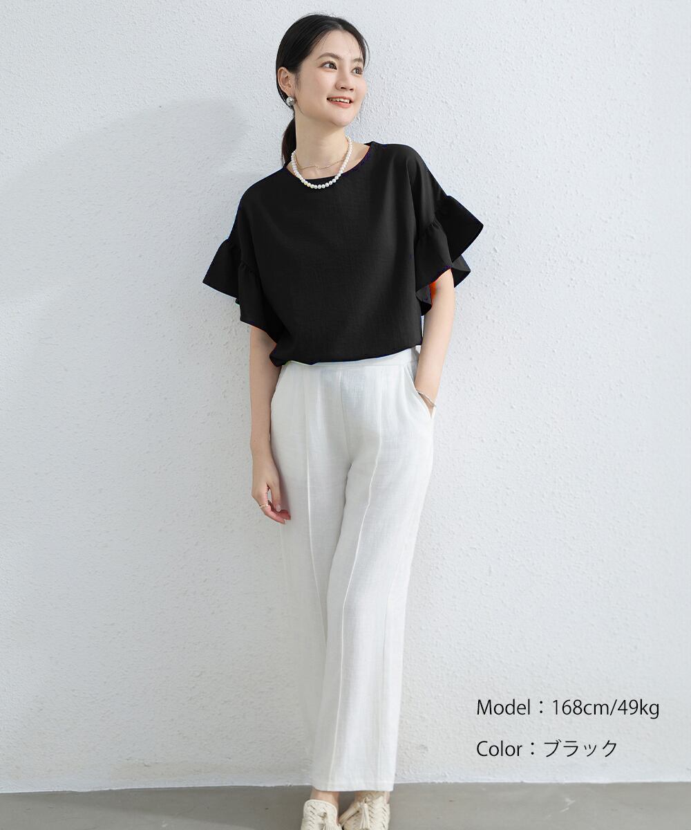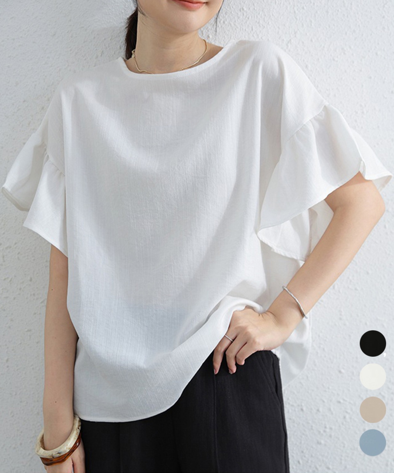 風通しのよいフリルスリーブ、夏の一枚着に最適のカットソー