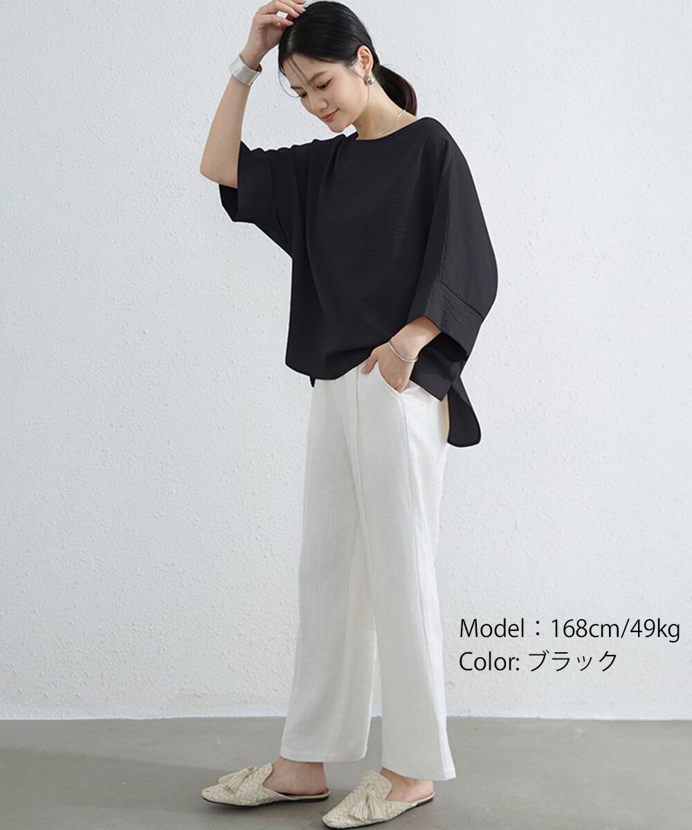 ドルマンスリーブで二の腕をさりげなくカバーしつつ、夏でも快適な着心地のカットソー