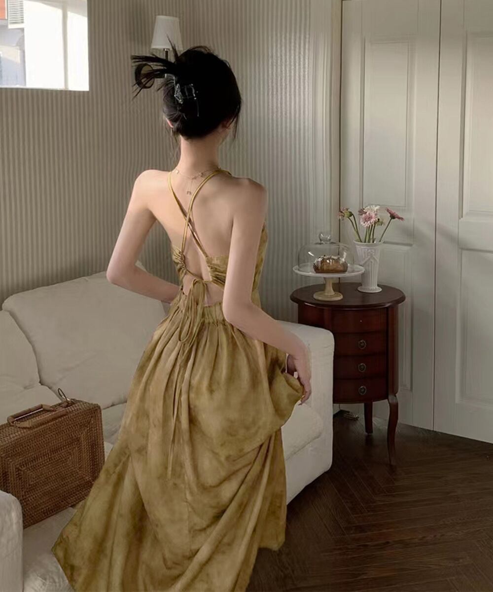 リゾートワンピース レディース バックオープン ロングワンピ体型カバー Vネック タイダイ柄ワンピース ハイウエスト旅行
